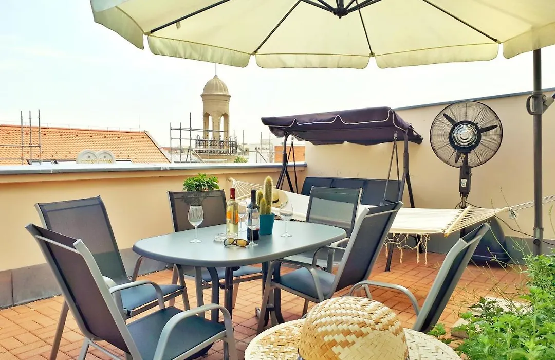 Im Stadtviertel Erzsébetváros gelegen, bietet das Apartment Rumbach Terrace Apartman Wohnmöglichkeiten mit Ausblick auf die Stadt. Haus des Terrors ist in 5 Autominuten und Synagoge der Dohánystraße ist in 5 Autominuten erreichbar.